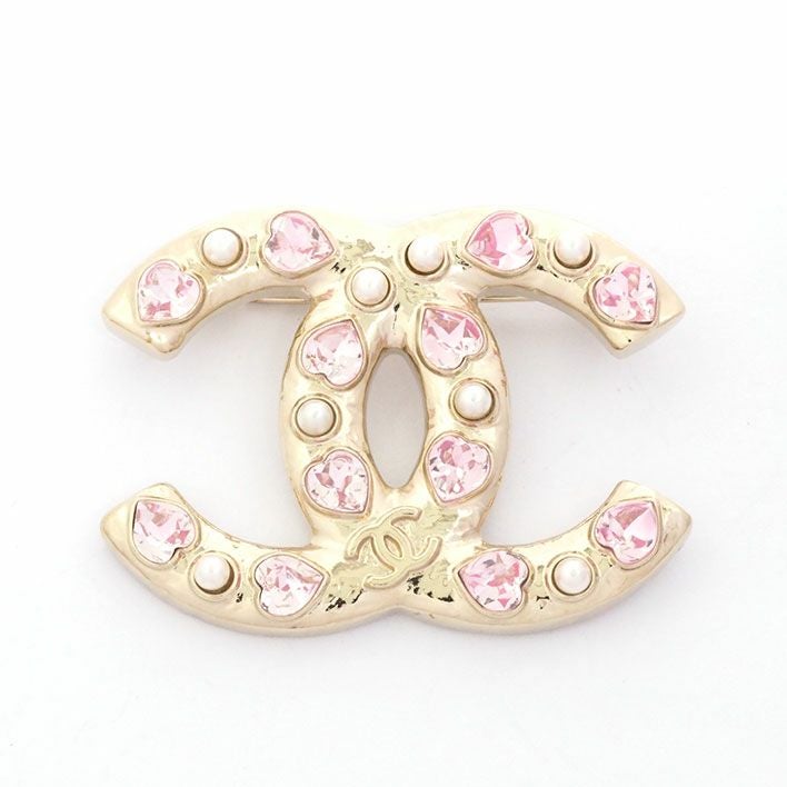 送料無料 / CHANEL / レディース シャネル ココマーク ハート ピンク×シャンパンゴールドカラー 回転ピンタイプ フェイクパール ラインストーン【ブローチ】【ジュエリー】| 中古