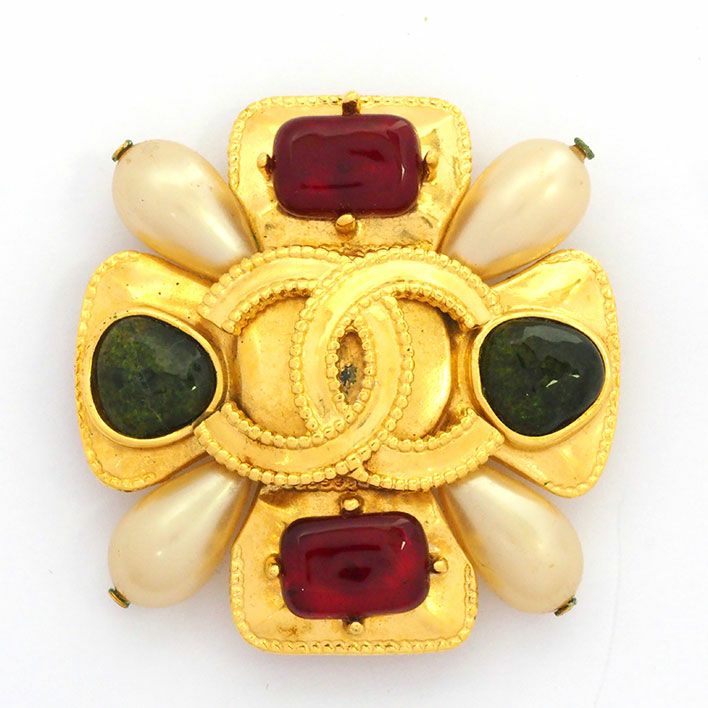 送料無料 / CHANEL / 男女兼用 シャネル グリポア バロックパール グリーン レッド ココマーク ガラス フェイクパール【ブローチ】【ジュエリー】| 中古